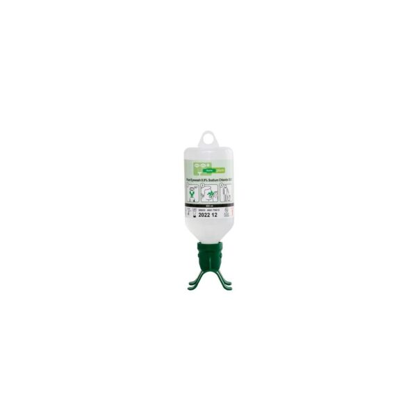 De flacon is voorzien van speciaal spoelstuk welke ervoor zorgt dat beide ogen tegelijkertijd gespoeld kunnen worden. De fles bevat oogspoeling van steriele zoutoplossing: 0,9% NaCl. De flacon is voor éénmalig gebruik.